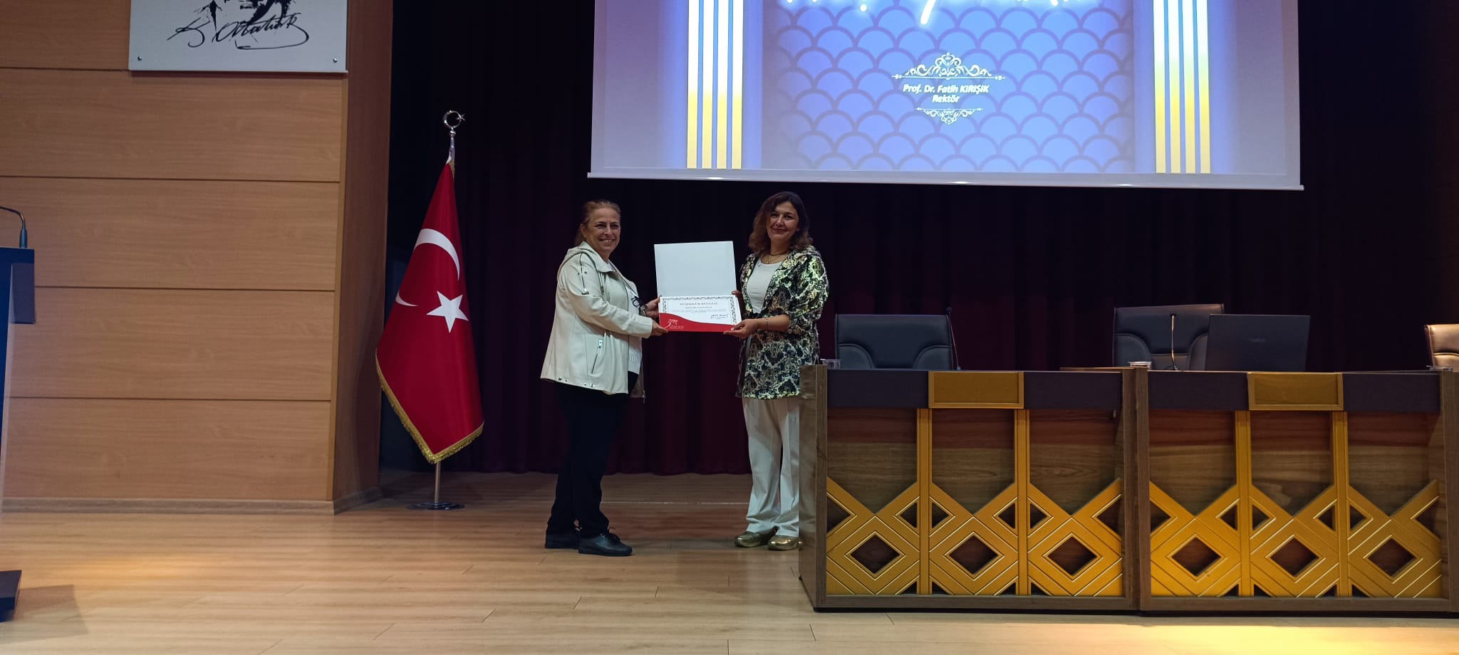 Eğitim sonunda Üniversitemiz Personel Daire Başkanlığı İdari Personel ve Eğitim Şube Müdürü Betül ERKAL tarafından Teşekkür Belgesi takdim edilmiştir.