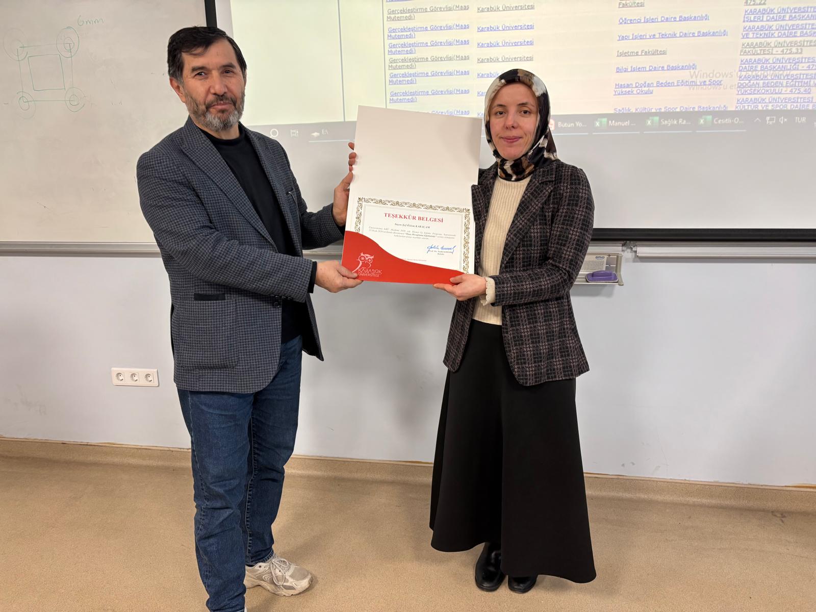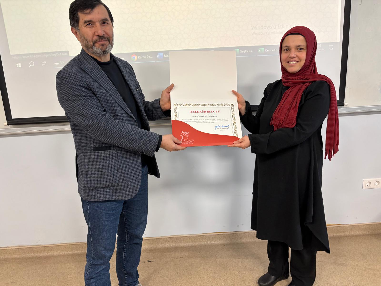 Eğitim sonunda Personel Daire Başkanı Şaban ÖZKAN tarafından Eğitimciler Şef Özlem KARAÇAM ve Şef Melahat TURAN ÖZDEMİR'e Teşekkür Belgesi takdim edildi.